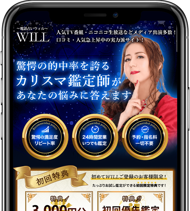 多数のメディア出演をされている有名占い師に初回で、しかも無料ポイント付きで占ってもらえるチャンスがあるのは電話占いウィルならではと感じました。